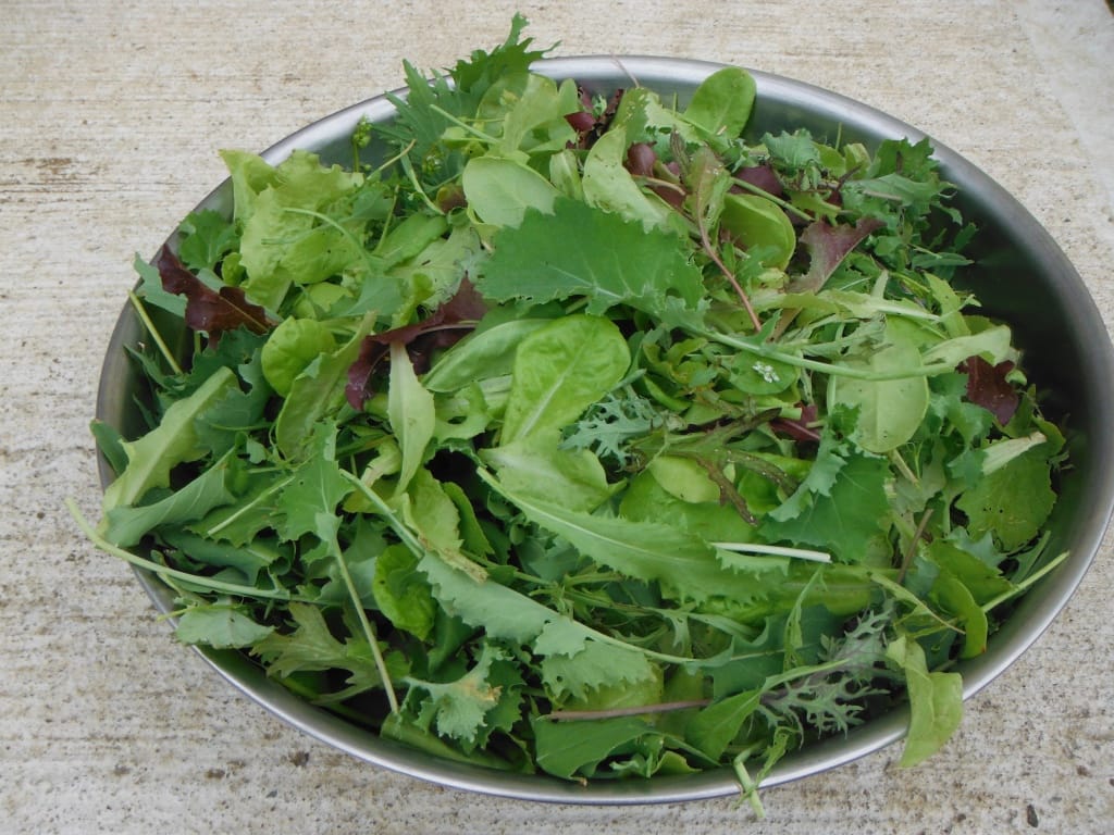 Our Salad Mix is a fine blend of red and green lettuces, mizuna, arugula, kales, and endive. Perfect for small gardens to have a cut-and-come-again salad bar.